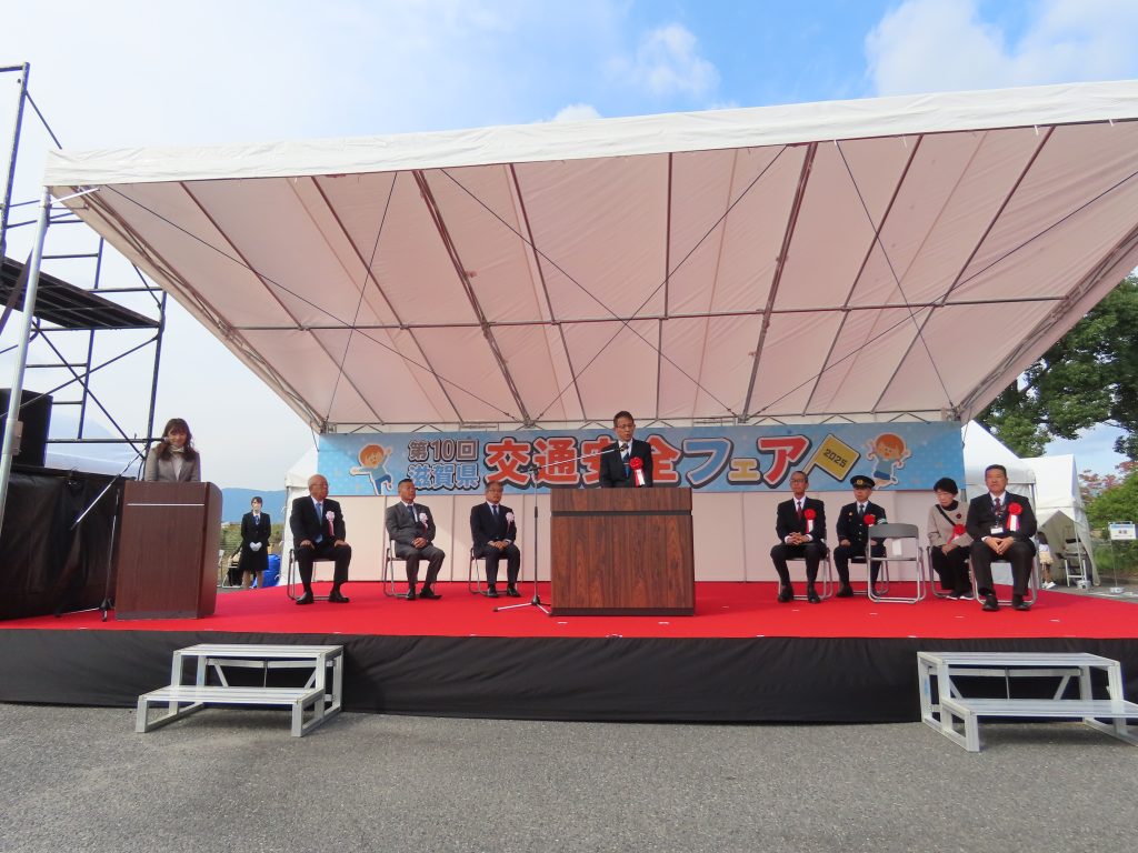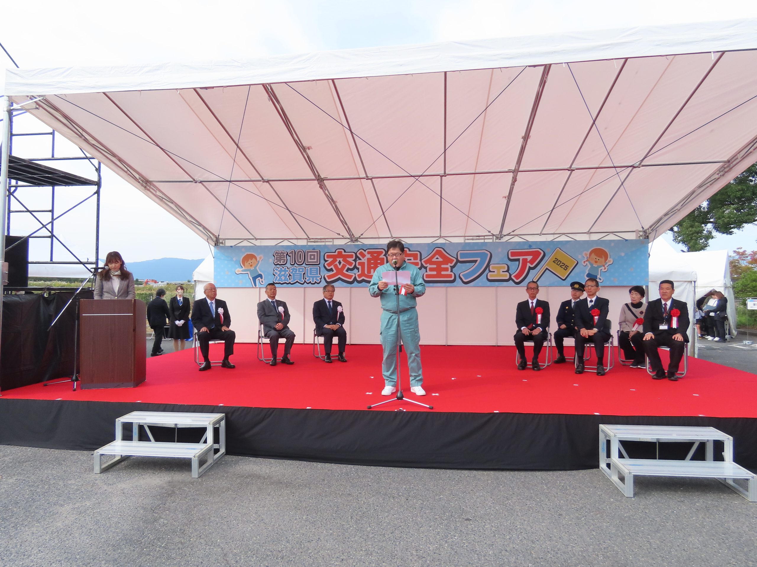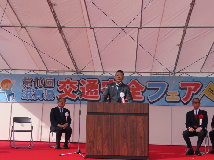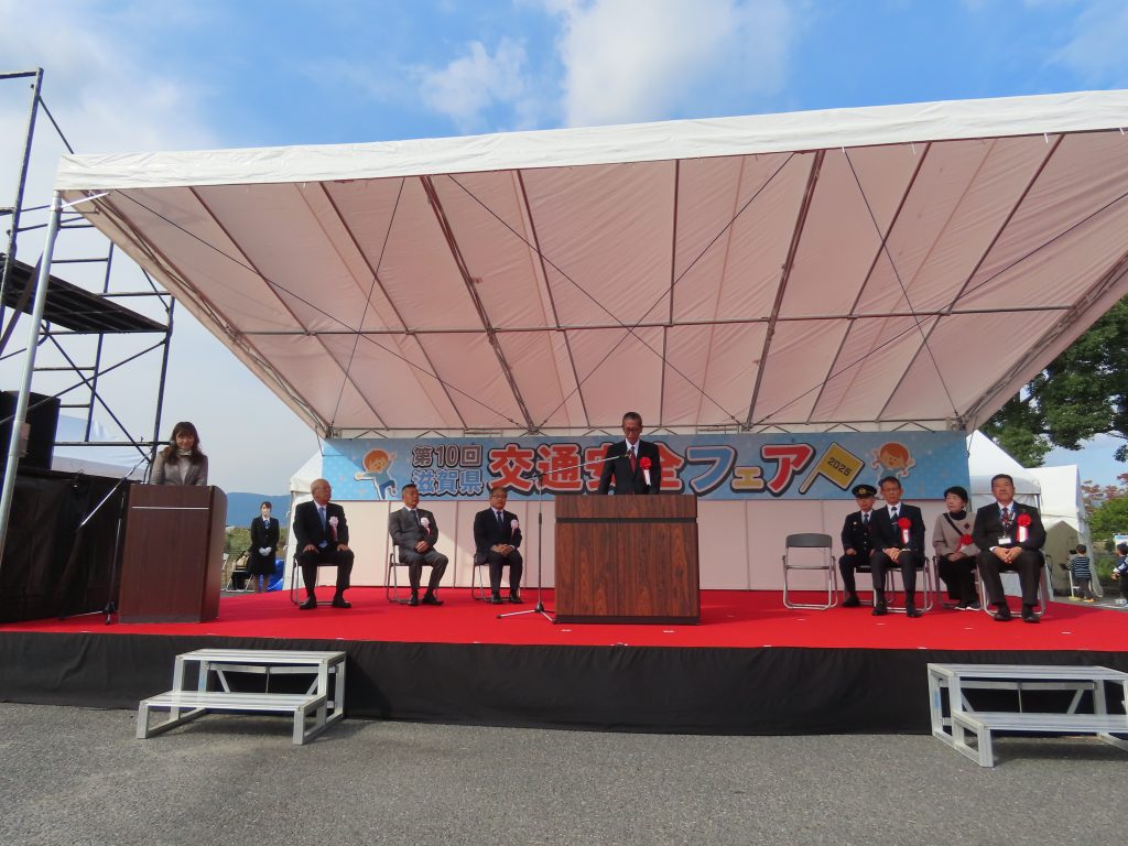 オープニングセレモニーにおいて滋賀県交通安全フェア実行委員会会長を務める当協会の松田直樹会長が開会宣言を行い、セレモニーの冒頭、交通事故の犠牲者を悼んで黙祷を行い、主催者を代表して滋賀県の東勝副知事が、「楽しみながら学んでいただき、本日の催しで学んだ交通安全・交通ルールを実践し、みんなで交通事故のない滋賀を実現しましょう」という三日月大造滋賀県知事からのメッセージを代読されました。