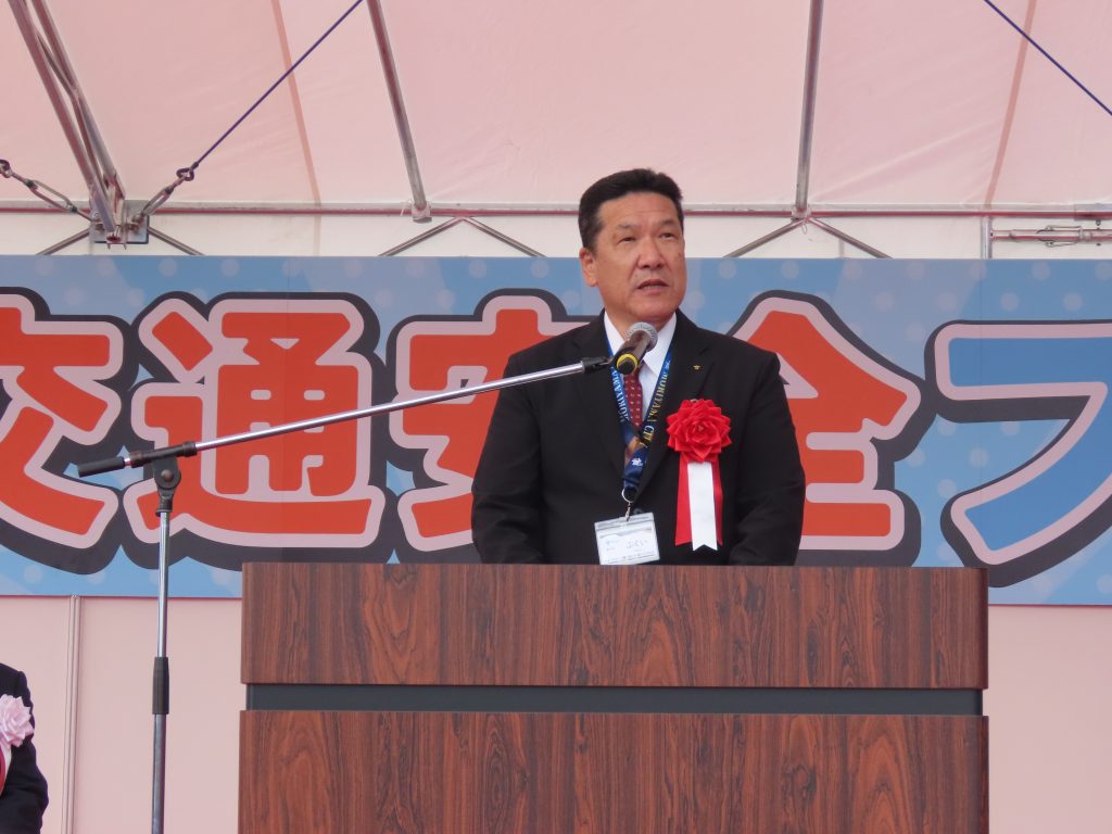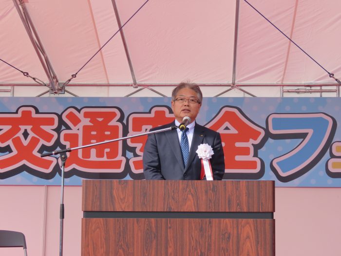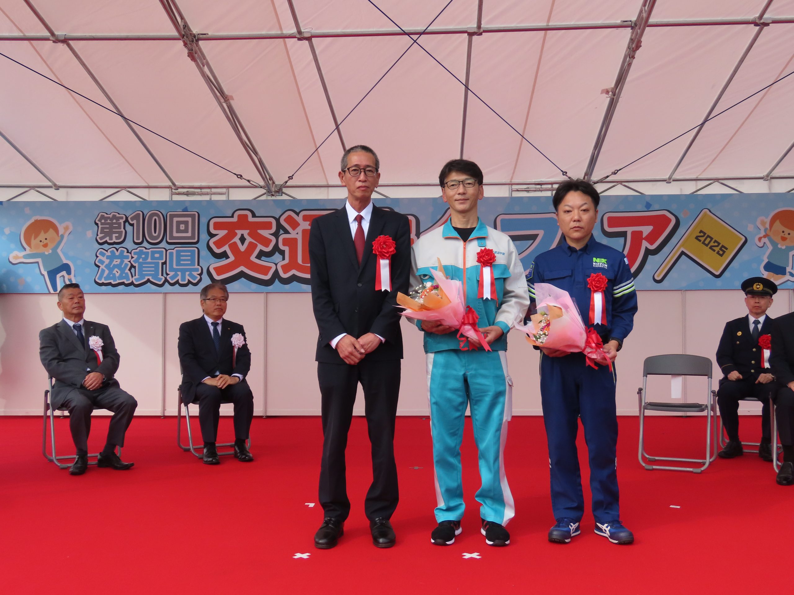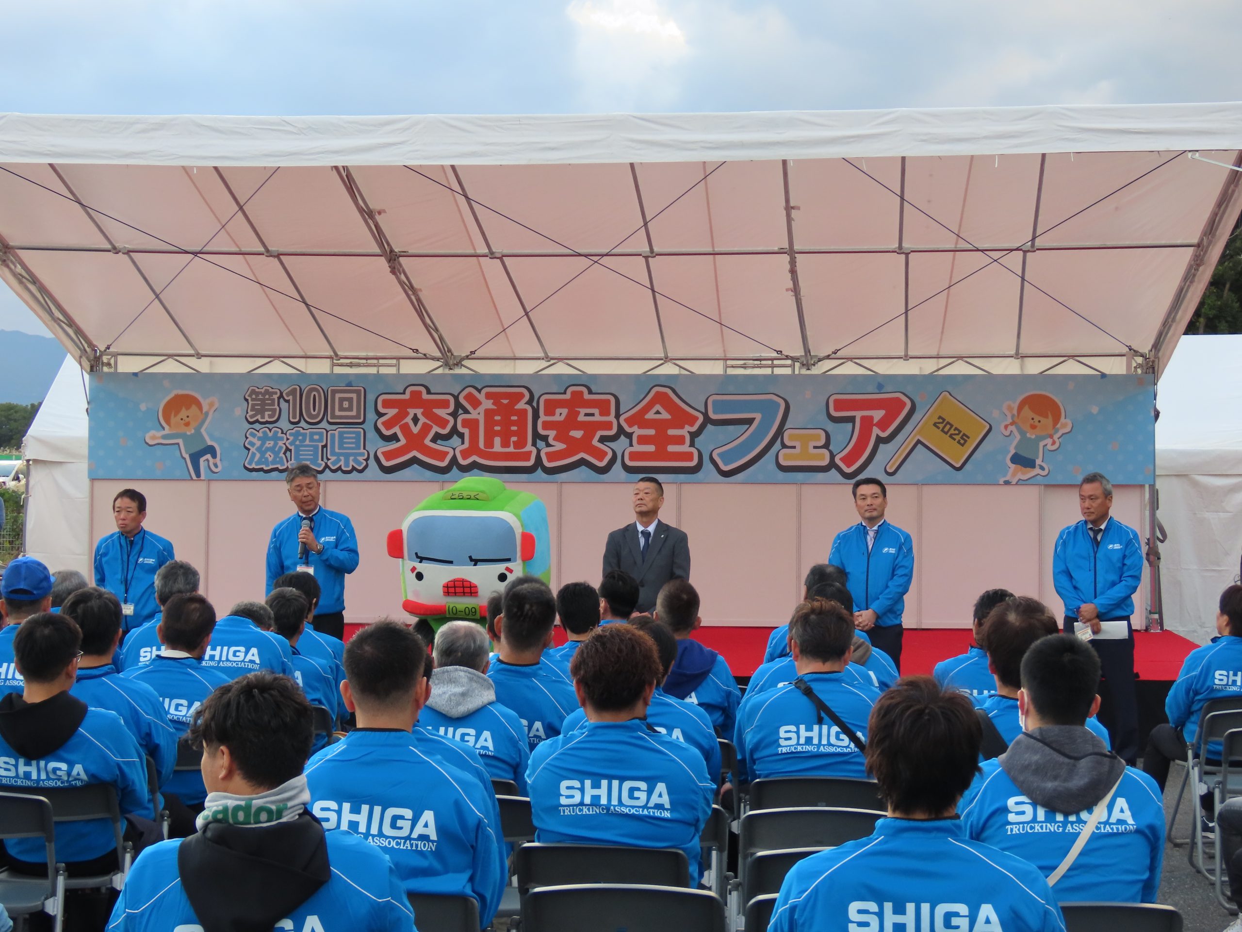 オープニングセレモニーにおいて滋賀県交通安全フェア実行委員会会長を務める当協会の松田直樹会長が開会宣言を行い、セレモニーの冒頭、交通事故の犠牲者を悼んで黙祷を行い、主催者を代表して滋賀県の東勝副知事が、「楽しみながら学んでいただき、本日の催しで学んだ交通安全・交通ルールを実践し、みんなで交通事故のない滋賀を実現しましょう」という三日月大造滋賀県知事からのメッセージを代読されました。