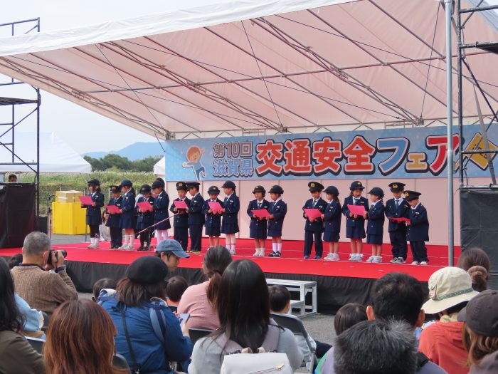 ステージでは滋賀県警察本部音楽隊や、地元の速野カナリヤこども園の園児のコンサートが行われ、子どもたちが元気に交通安全宣言を読み上げて安全運転を訴えました。