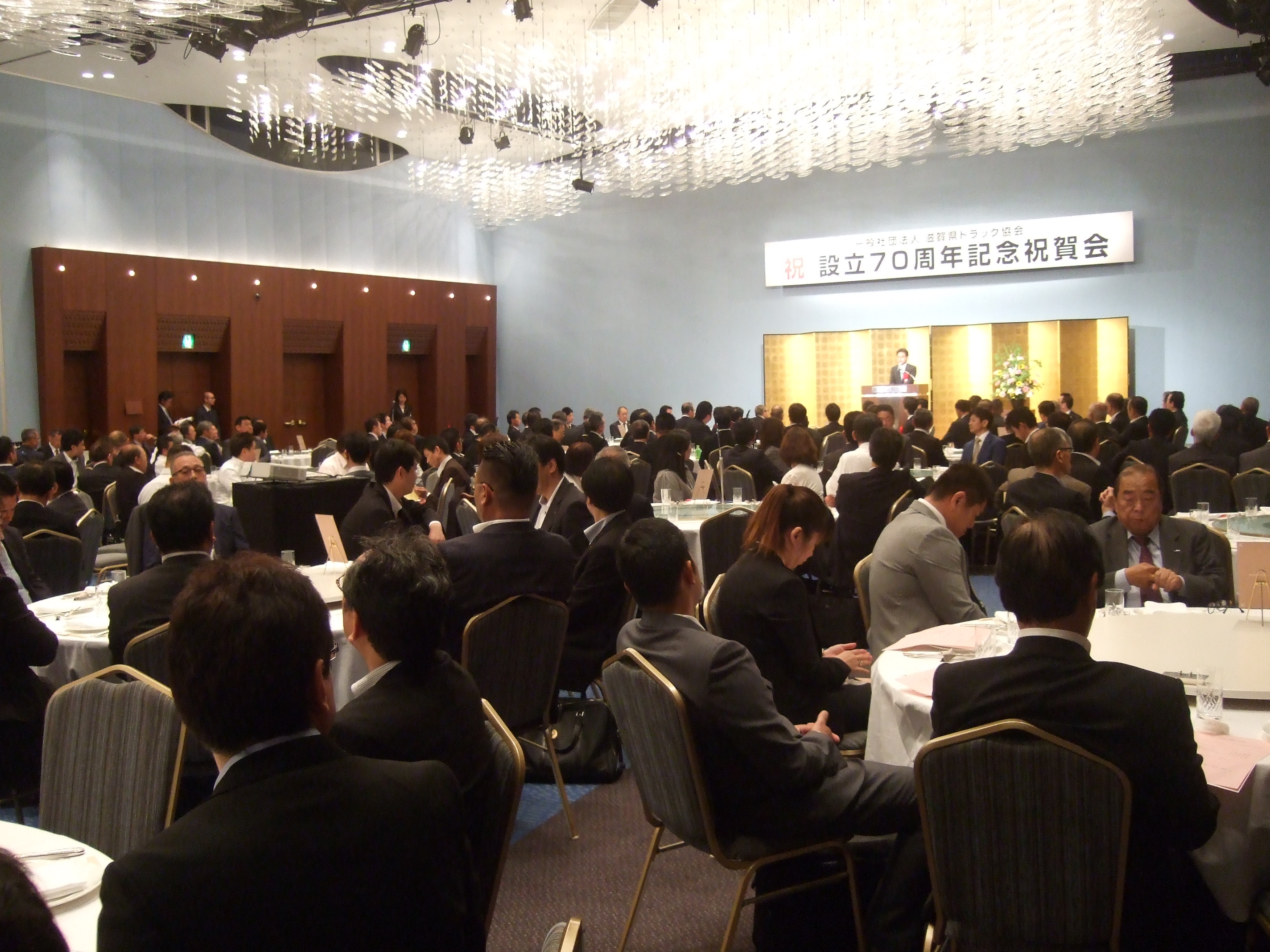 続いて同じ会場で協会創立70周年記念祝賀会が開催され、協会の70年の歩みを紹介する映像に続いて、田中会長が「昭和23年に産声をあげた協会は、諸先輩方の多大な努力に支えられ70周年を迎えることができた。三方良しの精神に基づき、先人に感謝しながら、次の80年、100年に向けて前に進んでいきたい」と開会の挨拶を行いました。