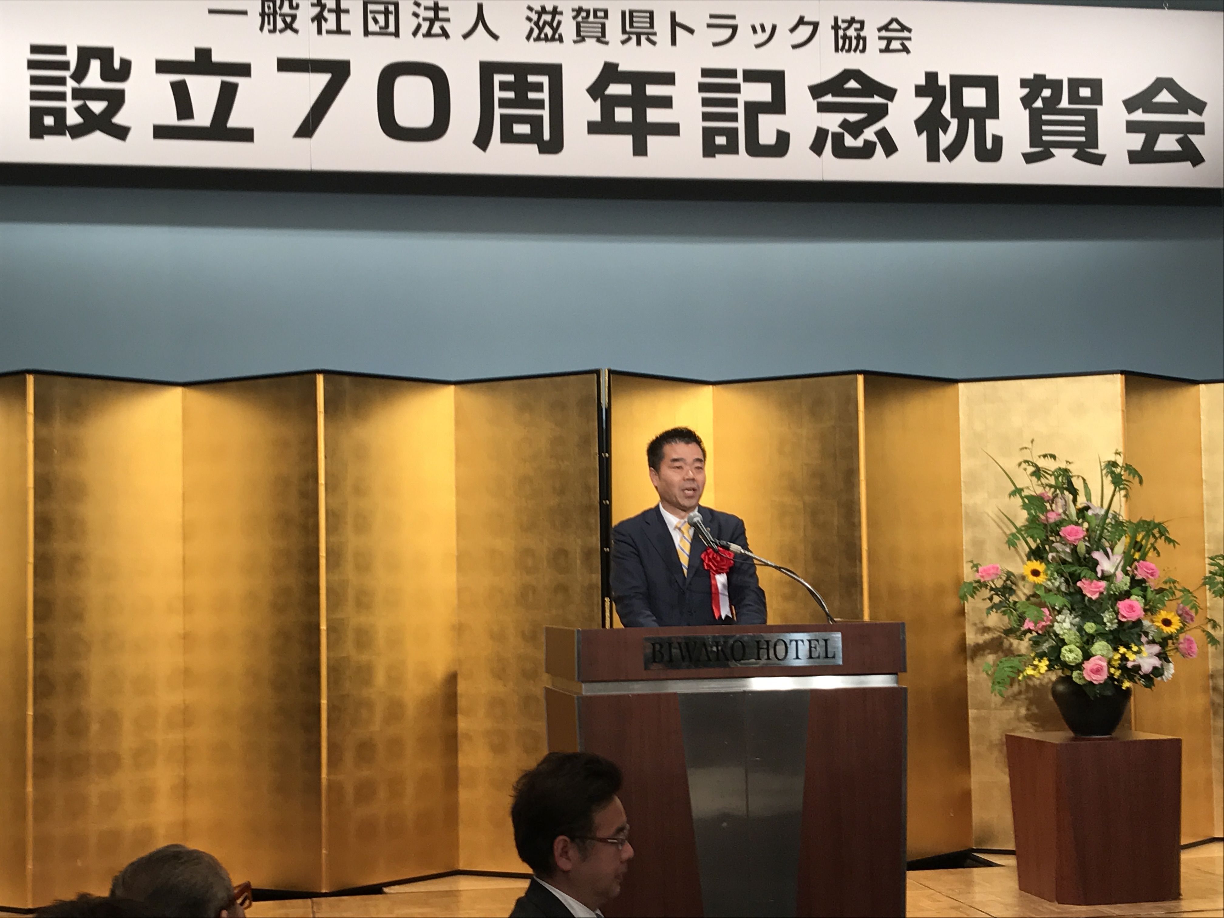 続いて、来賓の三日月大造滋賀県知事、上野賢一郎財務副大臣、坂野公治近畿運輸局長、鎌田徹郎滋賀県警察本部長、村井秀吉滋賀労働局労働基準部長、坂本克己公益社団法人全日本トラック協会長からご祝辞をいただき、近畿運輸局滋賀運輸支局長の乾杯のご発声により、祝宴がスタートしました。